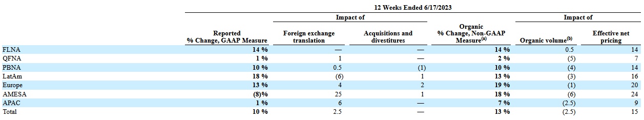 菲多利北美销售额同比增长 14%,达到 59 亿美元,预期为 57.7 亿美元。桂格食品北美销售额同比增长 1% 至 6.84 亿美元,预期为 7.04 亿美元。北美饮料同比增长 10%,至 67.5 亿美元,预期为 66.4 亿美元。欧洲销售额同比增长 13%,至 34.2 亿美元,预期为 31.4 亿美元。拉丁美洲销售额同比增长 18%,至 28 亿美元,预期为 27 亿美元。非洲/中东地区销售额同比下降 8% 至 15.7 亿美元,预期为 16.2 亿美元。亚太地区销售额同比增长 1%,至 11.2 亿美元,与预期一致。虽然大部分地区/公司都取得了营收增长,但是主要是依赖于涨价带来的业绩驱动,而整体的销量出现了负增长。不过对于不考虑汇率损失、收购和资产剥离的非 GAAP 下的内生增长(有机销售额增长)来说,各个地区/公司都是取得了不俗的增长。