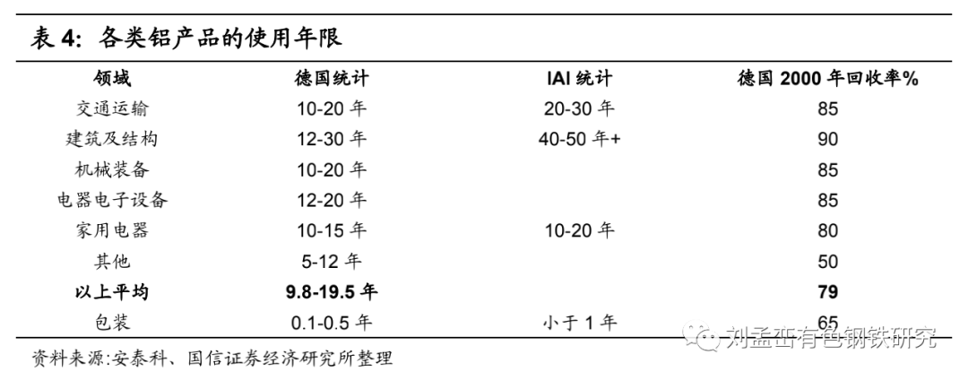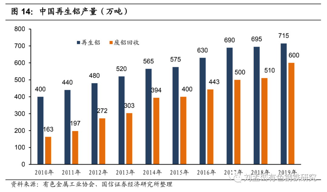 但我国再生铝产量增长较快,根据物资再生协会统计,2019 年我国再生铝年产量达到 715 万吨,同期我国原铝产量 3542 万吨。生产的再生铝中,大部分来自国内废铝回收,其余部分来自进口废铝。根据安泰科估计,随着越来越多的含铝消费品达到使用寿命,我国将迎来废铝回收快速增长期,预计 2023 年超过 1000 万吨,2030 年超过 1700 万吨,2020-2030 年再生铝产量年复合增长率为 8.2%,比 2010-2019 年增长 2.6 个百分点。