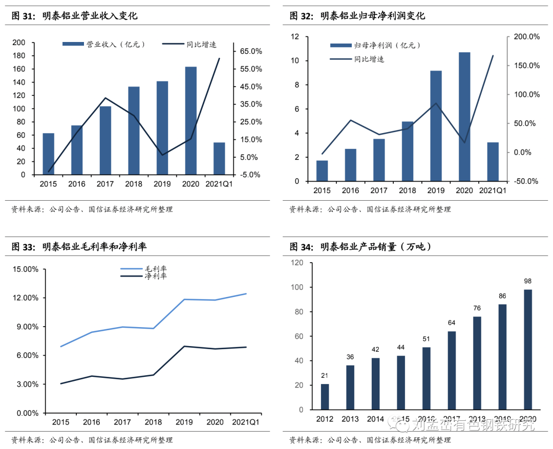 明泰铝业近年来大力发展资源循环利用产业,已建成 30 万吨废铝处理产能,扩建后年处理规模可达 68 万吨。另有年处理 6 万吨(第一期工程,总共 12 万吨)铝灰渣项目进展顺利。2021 年起铝灰列入国家危废名录(豁免条件:铝灰渣和二次铝灰以回收金属铝的利用过程不按危废管理),公司铝渣转化成盐渣回收工艺技术实现 100% 的永续循环利用,全过程无废水、废气和固体废物产生,大力推动铝行业低碳循环高质量发展。公司通过产品结构升级和优化原料来源,实现业绩稳定高速增长。