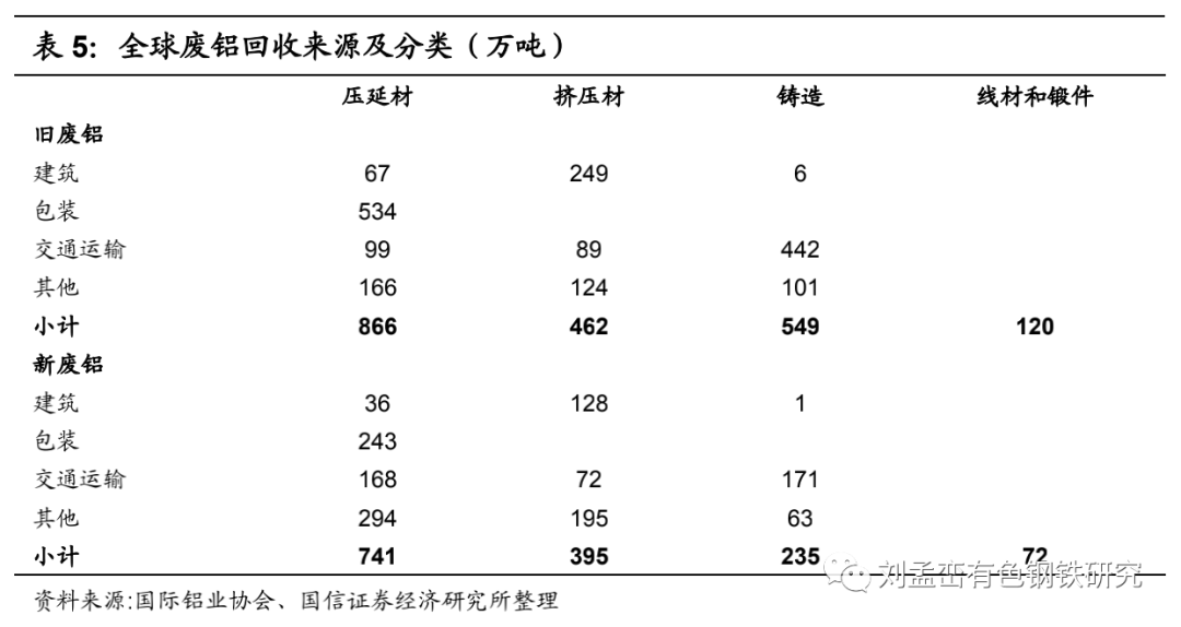 根据国际铝业协会统计数据,2019 年全球共产生旧废铝 1997 万吨,新废铝 1443 万吨。旧废铝最大的来源是包装领域,主要是废旧易拉罐,其次是交通运输领域,主要是报废汽车。这两个领域铝消耗量大,且回收率高。