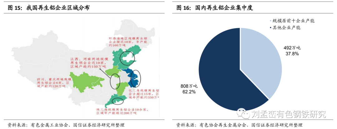 我国再生铝企业主要分布在工业发达且便于进口废旧金属的沿海地区,如环渤海、长三角、珠三角、川渝地区,以及具有产业基础和政策扶持的江西、河南等地。根据有色金属工业协会再生分会的数据,2019 年我国再生铝企业产能超过 30 万吨有 8 家,产能介于 10-30 万吨的有 19 家,产能介于 5-10 万吨的有 36 家。工信部对再生铝企业规模规定为新建再生铝项目规模应在年产 10 万吨以上,现有再生铝企业生产规模不小于年产 5 万吨。近年来有关部门对再生铝企业生产装备、环保措施、能耗等方面的规定趋严,尤其是生态环境部将铝灰纳入《国家危险废物名录(2021 年版)》,具备危废处理资质和设备的企业受益,而不具备危废处理资质的中小企业生产成本将抬升。