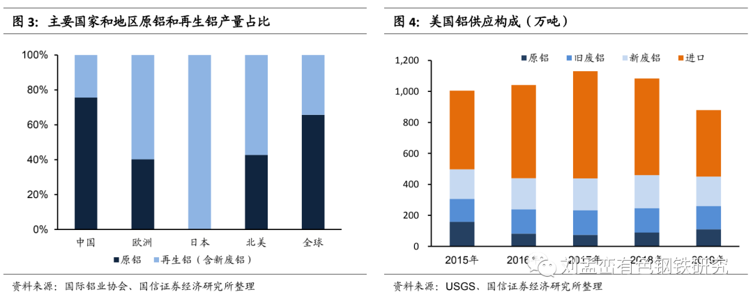 国外发达国家经历了长期工业化进程,社会积蓄的废铝远高于中国,因此国外发达国家铝供应端废铝占比较高。如下图所示,在不考虑进出口的情况下,中国再生铝(含新废铝)产量占原铝和再生铝总量的 24.4%,欧美国家占比在 60% 左右,全球平均水平 34.3%,说明我国再生铝产量相对原铝产量仍然偏低,再生铝产量具有广阔的空间。