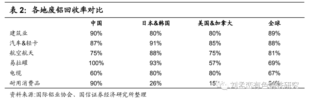 铝具有良好的回收特性,回收率高于其他材料。由于铝一般用作结构件,且耐腐蚀,多次利用仍不改变性质,因此铝具有良好的回收性。根据国际铝业协会的数据,全球历史上总共生产的 15 亿吨铝中,有 75% 仍在被使用,其中铝制易拉罐回收率 69%,是所有饮料包装材料中回收率最高的一类。我国废铝回收率高于全球平均水平,尤其是铝合金易拉罐几乎可以做到 100% 回收利用。