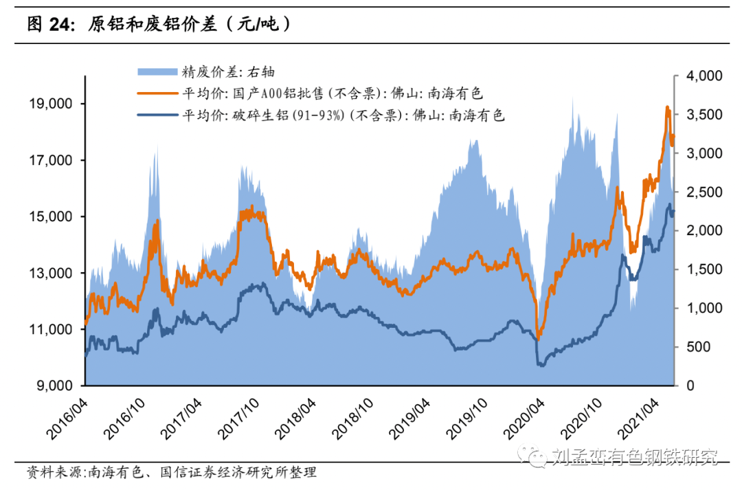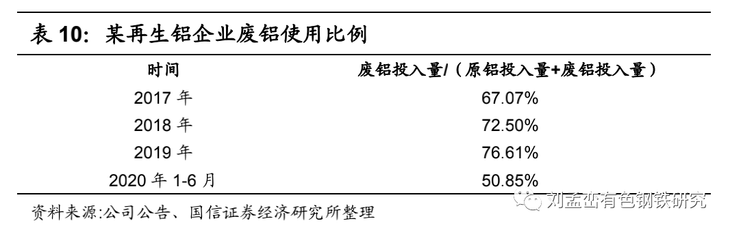 原铝和废铝具有一定的相互替代性,但替代性受经济性、产品成分要求、工艺水平等因素制约。影响企业废铝添加比例的重要因素是原铝和废铝的价差。在铝价上涨过程中,原铝价格涨幅大于废铝价格涨幅,精废价差扩大;在铝价下跌过程中,原铝价格跌幅大于废铝价格跌幅,精废价差收窄。精废价差越大,企业提高再生铝使用比例的意愿就越强,但也要考虑铝合金产品的元素含量标准。相反,如 2020 年 3、4 月份,国内废铝回收受疫情影响大幅减少,而疫情结束后需求迅速回暖,造成原铝和废铝价差急剧收窄,出现了原铝对废铝的反向替代,如再生铝生产企业永茂泰在 2020 年 1-6 月废铝投量占比显著下降,主要原因就是废铝供应量减少,精废价差收窄,公司增加了原铝投入量。