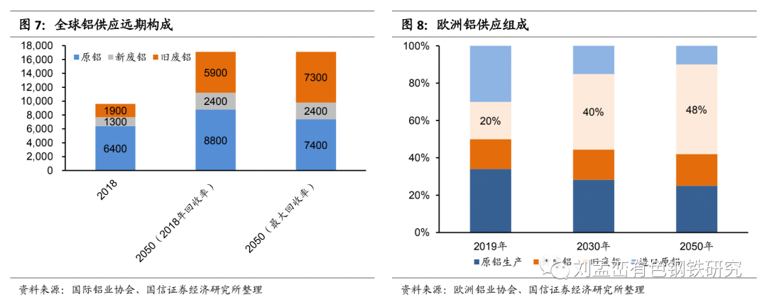 压减铝行业碳排放是全球共识,而扩大再生铝使用是国外减少碳排放的主要路径之一。2020 年 4 月份,欧洲铝业协会宣布启动《再生铝行动计划》,力争到 2050 年再生铝能占到铝供应量 50%,替代高碳排放强度的进口原铝,在降低进口铝依赖度的同时,达到降低碳排放 46% 的目的。