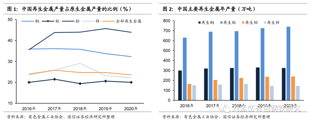 根据中国有色金属工业协会数据,“十三五” 期间,我国再生铜、再生铝、再生铅、再生锌产量分别约为同期原生金属产量的 35%、20%、42%、25%。