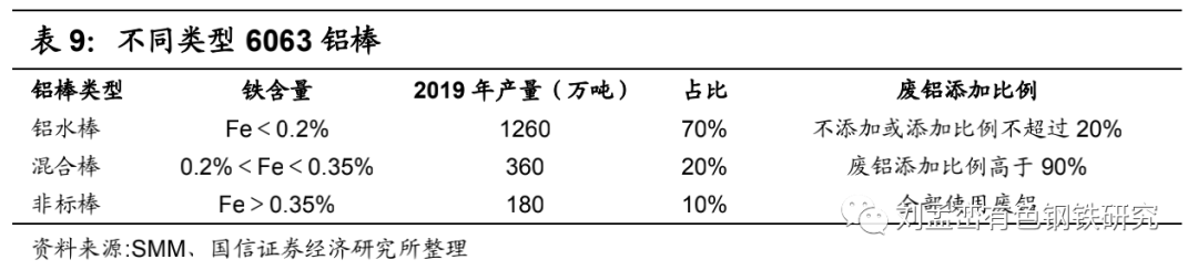 铝棒是最大的一类铝加工中间品之一,铝加工企业开始提高废铝替代原铝的比例,如 2019 年废铝生产重熔铝棒产量超过 100 万吨。根据行业研究机构 SMM 统计,近年来使用再生铝的重熔铝棒市场份额逐步增加,2019 年铝水棒产量占比 70%,剩余 30% 则基本由再生铝生产。在不显著影响铝棒合金成分的前提下,使用废铝可以显著降低企业原料成本。