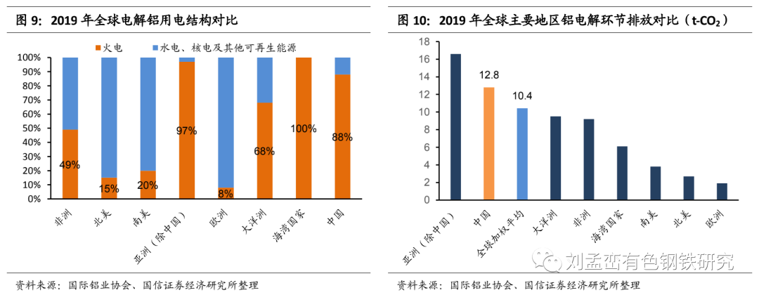 我国加大再生铝使用更迫切。根据国际铝协数据,2019 年全球电解铝能源结构中,煤电占 60%,水电站 24.8%。我国能源禀赋决定了我国铝工业用电以火电为主,我国电解铝行业中煤电占比高达 88%,远高于全球平均水平,导致我国电解铝单位排放量偏高,具有更大的减排压力。
