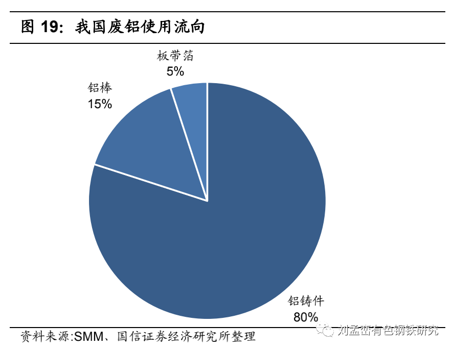 国内回收和进口的废铝杂质含量高,大部分重熔后制造成压铸铝合金,2019 年我国再生铝产量 715 万吨,其中压铸铝合金产量 500 万吨,占比 70%,变形铝合金产量 215 万吨,占比 30%。相较于变形铝合金,压铸铝合金铝含量较低,容许含有较多的杂质元素,因而大部分废铝最终做成铸造铝合金。根据行业研究机构 SMM 统计的数据,再生铝有 80% 最终用作铝铸件,15% 流向铝棒,剩余 5% 进入板带箔,即大部分旧废铝最终被降级利用。