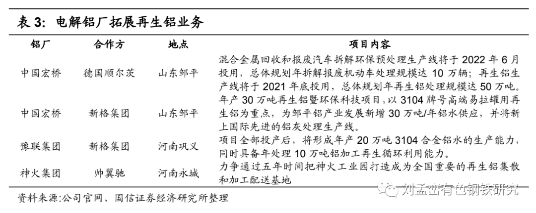 在当地发展再生铝可以在能耗、环保压力不大的情况下解决部分铝水短缺问题,如新格集团与魏桥、豫联等电解铝企业合作,利用山东、河南等地电解铝企业异地搬迁后空余厂房建设再生铝生产线,通过铝水直供方式与下游企业形成配套,弥补因电解铝企业搬迁后造成的当地铝水供应缺口。
