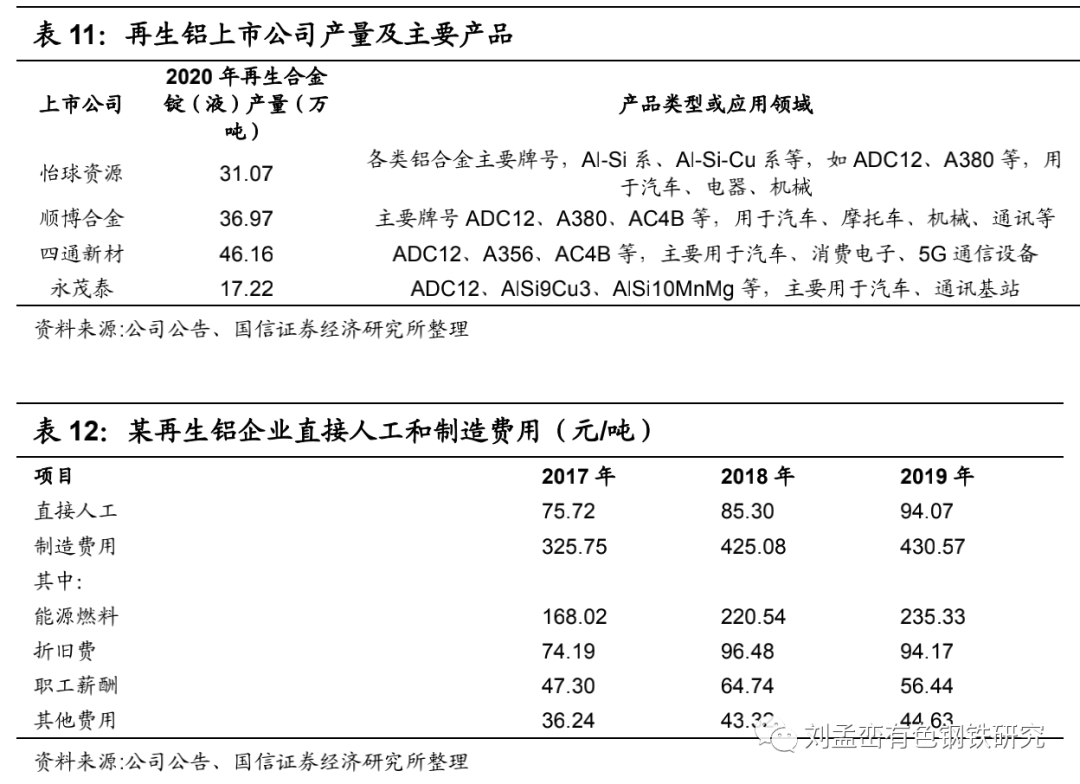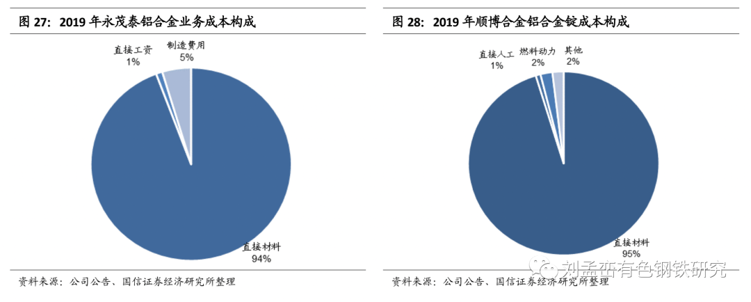 再生铝成本构成中,直接材料占 90% 以上,主要是废铝,还有少量铜、硅等合金材料。考虑到各个企业再生铝加工成本差异较小,产成品销售有公开市场报价,因此废铝采购成本是各个企业生产成本的主要差别。