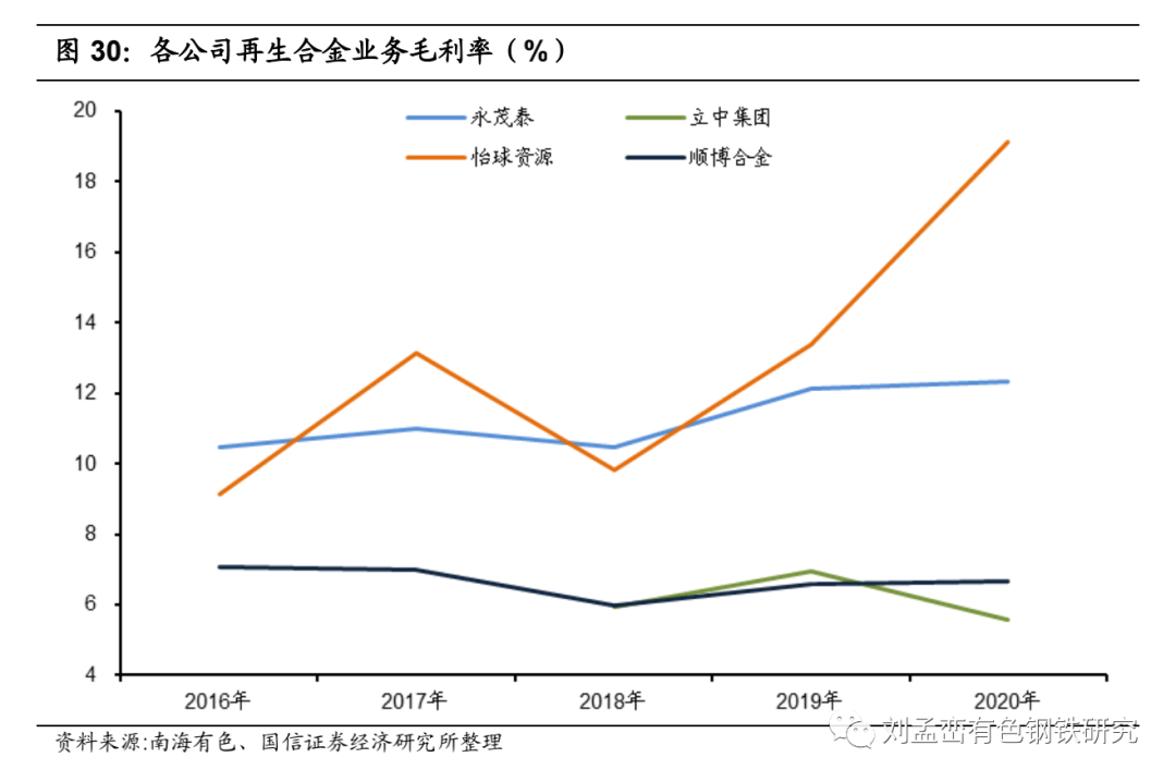 “料重工轻” 的行业特征导致各公司的再生铝合金业务毛利率总体偏低,原料采购成本是各公司间盈利能力差别的主要原因。如下图所示,怡球资源毛利率显著高于同行业公司,且毛利率波动远大于同行业公司。怡球资源毛利率偏高的原因是公司废铝主要采购自国外,并且在 2016 年收购了美国废旧金属回收商 Metalico,打入国外废铝回收市场,而国外废铝采购价格普遍低于国内。怡球资源毛利率波动大同样与其废铝采购渠道有关,美国是怡球资源最大的废铝采购来源,2018 年中美贸易摩擦,中国对进口自美国的废铝征收 25% 关税,导致公司进口原料成本抬升,公司合金锭业务毛利率大幅下滑;2019 年下半年开始我国废铝进口实行批文制,废铝进口受限而再生合金锭进口大增,怡球资源在马来西亚拥有 26 万吨再生合金锭生产线,因此公司 2019 年毛利率迅速恢复;2020 年铝价在 3 月份探底后反弹并一路上涨,公司库存成本偏低,因而 2020 年毛利率大幅增加。另外三家公司原料采购主要来自国内,受国家进出口政策影响较小,毛利率较为平稳。