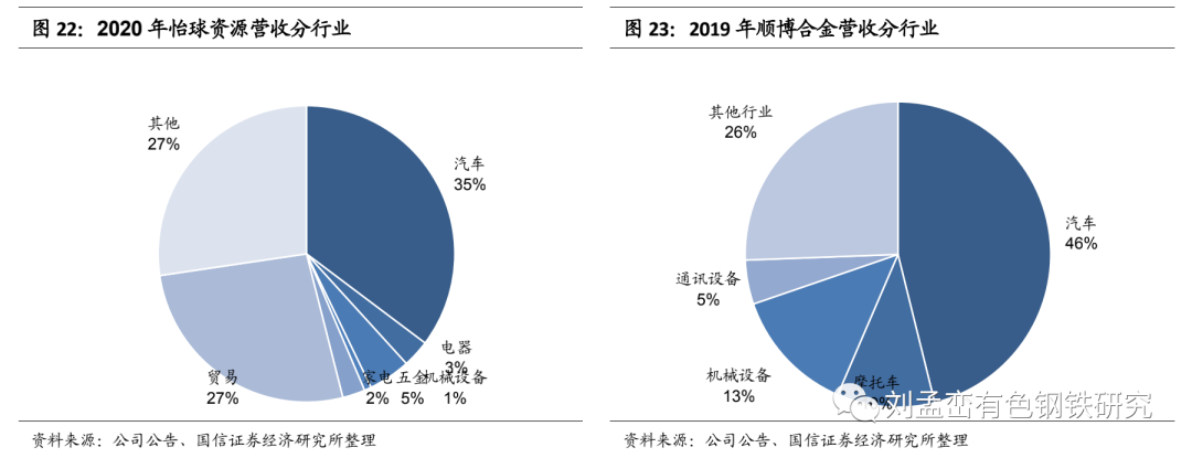全球铝压延材龙头企业诺贝丽斯,同时也是全球最大的再生铝回收利用企业, 2020-2021 财年诺贝丽斯其产品中的再生铝用量占比达到 61%。根据安泰科的报道,诺贝丽斯与福特、沃尔沃等主机厂合作开展 “汽车板—冲压废料—汽车板” 的闭环回收体系建设,将主机厂冲压废料和回收的报废汽车板生产汽车板供应客户,可以显著减少对于原铝的需求和合金元素的添加。除此之外,诺贝丽斯与客户合作开发 6 系汽车内板,摆脱现有 6 系汽车外板和 5 系汽车内板的合金搭配,减少汽车板合金种类,提高其回收效率,降低回收成本。除了与下游客户建立闭环回收系统(Closed-loop recycling system)之外,公司还回收大量旧废铝,2021 财年公司回收了 740 亿个废旧铝易拉罐,以及印刷板、建筑、交通等领域废铝,再生铝总采购量达 220.3 万吨。