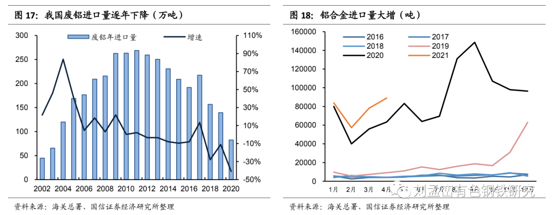 总体来看,我国废铝供应格局是以国内废铝回收为主,国外废铝和再生合金锭是重要补充。随着国内废铝积蓄量逐渐增加,以及 2000 年以来中国铝消费快速增长,未来几年国内废铝回收量有望显著增加。进口废铝及合金锭主要受废铝进口政策影响,生态环境部主导的禁止洋垃圾入境推进固体废物进口管理制度改革在 2021 年初圆满收官,历时三年废铝进口政策调整基本稳定下来,相关企业正在适应《再生铸造铝合金原料》新国标。另外近几年废铝进口调控使得再生合金锭进口大增,成为替代进口废铝的另一种形式。