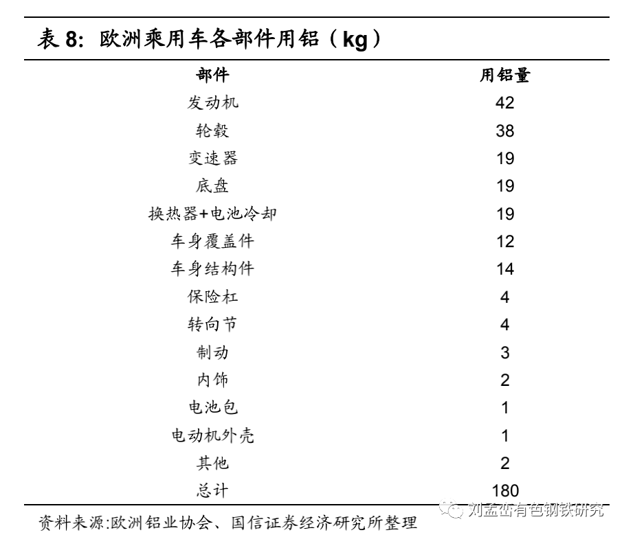 汽车用再生铝面临新挑战。近年来随着新能源汽车普及,汽车当中的铝应用形式发生了改变。根据欧洲铝业协会对欧洲在产乘用车,包括燃油车和电动车所用铝部件进行统计,得出各个部分的用铝量平均值如下表所示,并认为随着电动车逐渐普及,汽车发动机用铝量、变速器用铝量将逐年下降,电池包、车身覆盖件、电动机外壳等部位用铝量将显著增加。该趋势同样适用于我国,随着汽车电动化推进,再生铝的重要消费领域燃油车发动机缸体缸盖、变速箱需求减少,而电动车新增用铝部件如电池包等很少使用再生铝,因此铝铸件包括再生铝在汽车用铝中的占比有可能减少。