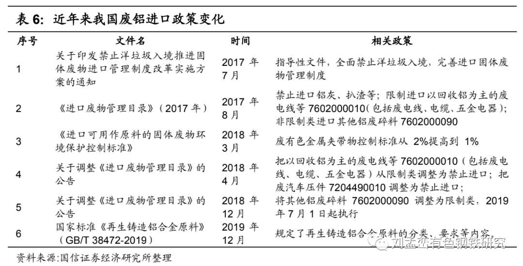 我国废铝进口政策总体趋严。近年来废铝进口政策收紧始于 2017 年,2017 年 7 月生态环境部会同 14 个部委共同推进禁止洋垃圾入境,推进固体废物进口管理制度改革行动,通过调整《进口废物管理目录》,将大部分废铝从非限制类进口调整为限制类进口,自 2019 年下半年开始,废铝进口实行批文制。从 2021 年开始,符合新国标《再生铸造铝合金原料》(GB/T 38472-2019)的废铝按普通货物进口,不属于固体废物,而不符合新国标的废铝则禁止进口。新国标对进口废铝要求总体严于国外同类标准,要求进口废铝中的夹杂物质量占比不超过 0.5%,高于旧国标 1% 的标准。