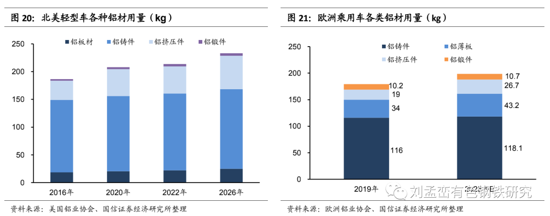 据安泰科统计,汽车行业占到再生铝消费量 60% 以上。汽车用铝部件集中在车轮(铝合金轮毂)、发动机缸体缸盖、曲轴箱、进气管、带轮、变速箱、油泵、保险杠等部件,这些部件大部分用铸造铝合金制作。随着节能减排压力带来的汽车轻量化需求,汽车用铝拓展到覆盖件(四门两盖)、全铝车身等部件。根据美国铝业协会的数据,2020 年北美地区轻型车用铝中,铝铸件占比达到 65.1%;根据欧洲铝业协会数据,2019 年欧洲乘用车用铝中,铝铸件占比 64.7%。铝铸件中大部分是再生铝,2015 年我国再生铝产量 575 万吨,根据有色协会再生金属分会数据,2015 年我国汽车用再生铝总量为 260 万吨,占再生铝产量 45.2%,是再生铝第一大应用领域。