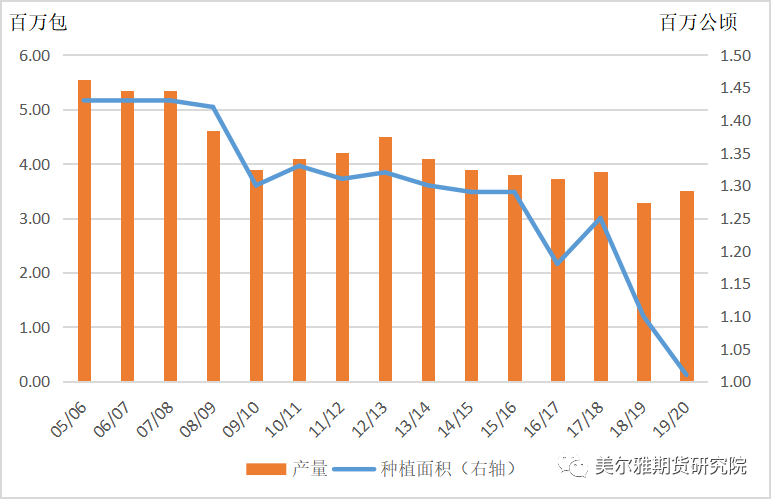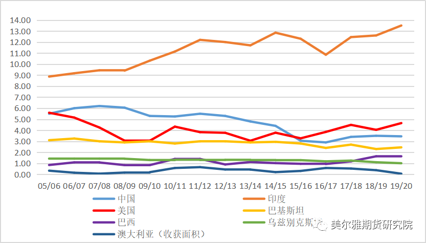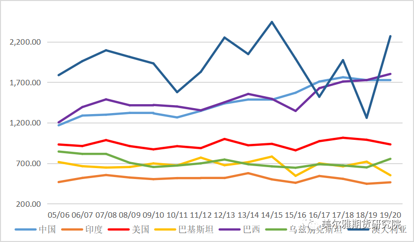 棉花主产国种植面积、单产及产量情况如图 1 至图 3 所示。其中,印度种植面积逐年增加,但其单产最低,其余国家种植面积逐渐趋于稳定;澳大利亚、巴西单产较高;中国种植面积和单产均处于较高位置,尤其是单产逐年递增,但中国人工成本较高。综合来看,19/20 年度全球棉花产量排名前三的国家为:印度、中国、美国。