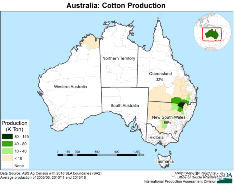澳大利亚是南半球东部的主要产棉国,棉花种植收获季节同北半球相反,每年 11-12 月份播种,次年 3-5 月采摘。澳大利亚棉区主要分布在东南部的新南威尔士州(产量可占到全国产量的 66%)和昆士兰州(产量可占到全国产量的 32%),如图 19 所示。棉区气候温暖至酷热,终年没有霜冻,光热资源丰富,适宜棉花生产发育,是澳大利亚棉花高产的重要原因之一。澳大利亚棉花科技含量和机械化水平均居世界先进水平,棉花衣分高,正常一般在 41%-42% 左右,全国平均单产已达到 2000 公斤/公顷左右,位居世界前茅。澳大利亚棉花主要用于出口,其国内消费量很少,近年来稳定在 8700 吨左右,如图 20 所示。