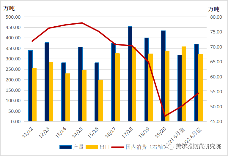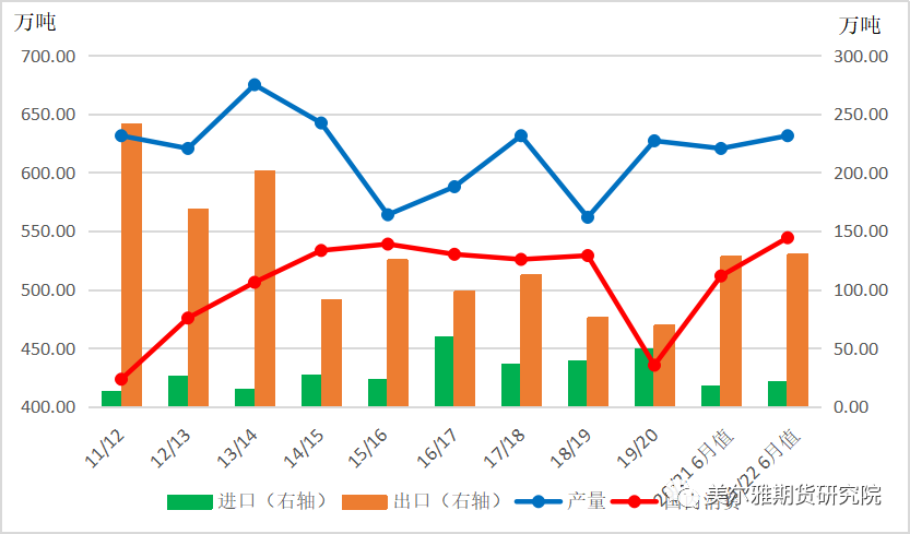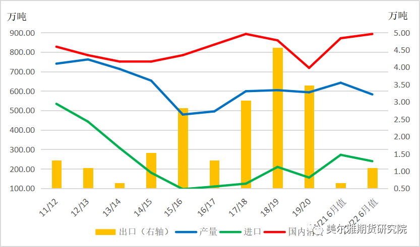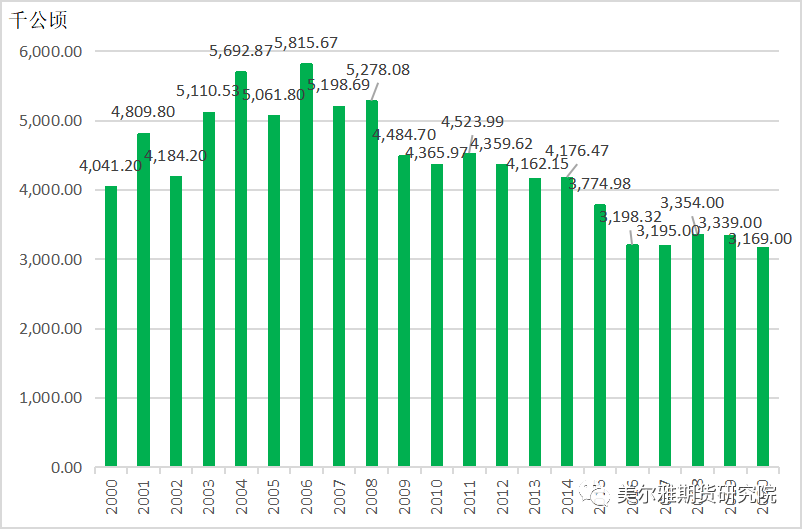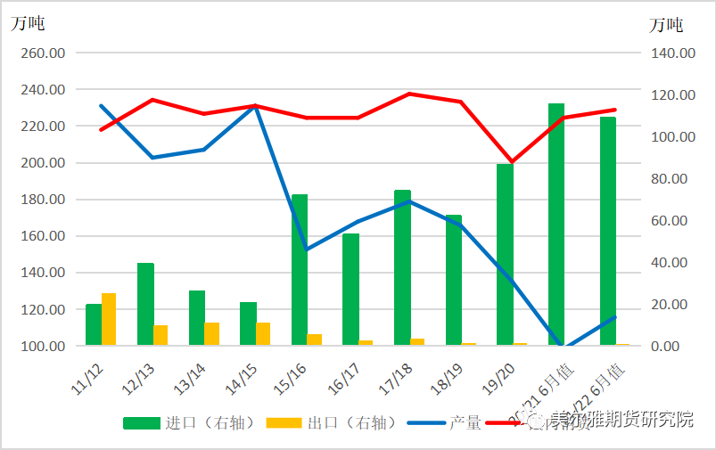 中国是棉花产销大国、进口大国。历年来产量大,但国内消费更大,一直是产不足需的状态,大量依赖进口,近年来进口量可达到 200 万吨左右,如图 12 所示。