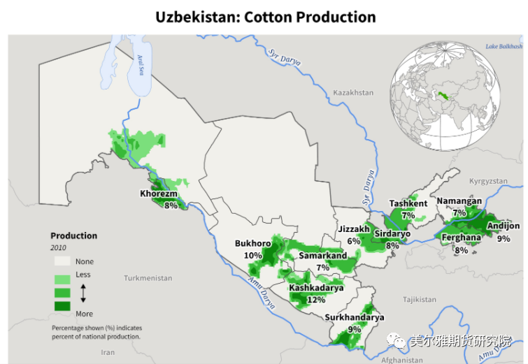 乌兹别克斯坦是中亚地区主要的产棉国,年产量在 80 万吨左右,以手摘棉为主。生产的棉花除少量用于国内消费外,大部分都用于出口。棉花在乌兹别克斯坦被誉为 “白金”,与黄金一起构成国民经济的 “黄白” 两大支柱。12 个州和 1 个直辖市都种植棉花,棉花是该国的战略物资。棉花种植期和收获期分别为:3-4 月,8-10 月。