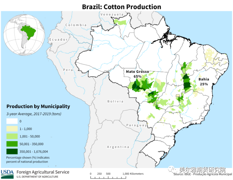 巴西从西到东形成植棉带,可分为 3 个棉区:中西棉区、南部棉区和东北棉区,如图 15 所示。其中,中西棉区产量可占到全国产量的 90%,棉花产量最大的两个州马托格罗索州、巴伊亚州都位于这一棉区。巴西地处南半球,幅员辽阔,得天独厚的地理位置和气候条件使该国每年可收获两季棉花。巴西中南部地区棉花播种期 9-11 月,采摘期次年 2-5 月;东北部地区棉花播种期为 4-5 月,采摘期为 8-11 月。此外,世界上 65% 的产棉国需要通过人工灌溉种植棉花,而巴西的主要产棉区集中在该国雨量充足的中西部地区,无需人工灌溉,大大降低了种植成本。