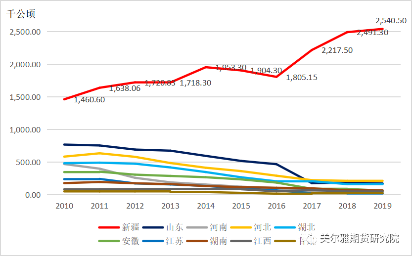中国棉花产地主要分布在新疆、长江流域和黄河流域,如图 7 所示。新疆是中国最大产棉区,近年来种植面积和产量逐年增加,长江流域和黄河流域各省份近年来棉花种植面积和产量逐年下降。中国棉花播种期和收获期依次为 4-5 月、9-11 月。中国棉花历年种植面积、单产及产量、主产省份历年种植面积和产量如图 8 至图 11 所示。