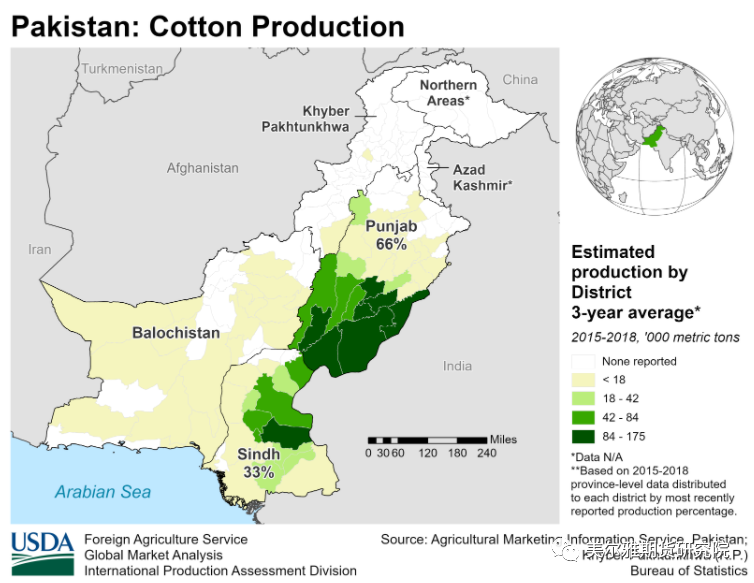巴基斯坦棉花主要种植在东部与印度接壤的旁遮普省、信德省,两省属典型的大陆性气候,无霜期长,且印度河流域良好的灌溉条件,加上棉花生长期间 70%-90% 为晴好气候,成熟和收花期基本无雨,优越的自然条件有利于棉花生长,纤维品质好。巴基斯坦棉花播种期 4-6 月,收获期通常在秋季。