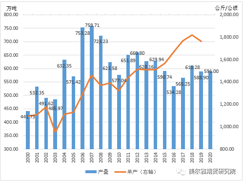 图 22 乌兹别克斯坦棉花种植面积和产量