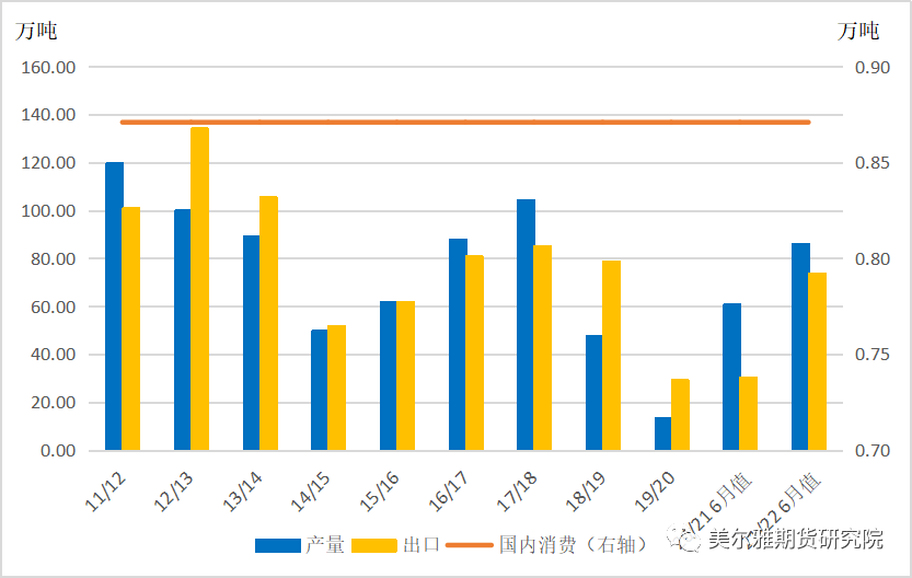 美国棉花主要用于出口,出口量可占到产量的 85% 以上,其国内消费量相对较少,进口量特别少,基本每年只有两三千吨,如图 14 所示。