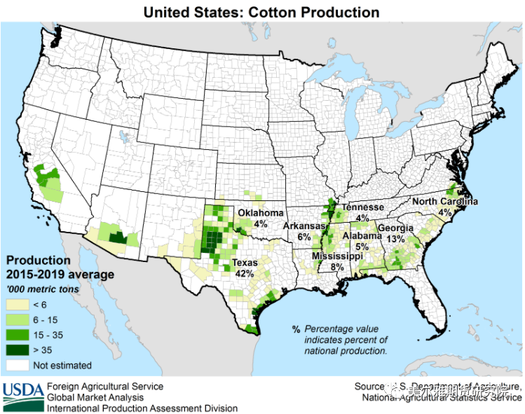 中南部地区包括阿肯色州,路易斯安那州,密西西比州,密苏里州和田纳西州。这一区域的棉花以供应国内消费使用为主,出口量极少。西南部棉区包括肯萨斯州,俄克拉荷马州和德克萨斯州,是美国棉花的主要出口地,一半以上的棉花用于出口,以中低等级的棉花为主。西部棉区包括亚利桑那州,加里佛尼亚州和新墨西哥州,是美国高等级棉花的生产基地。美棉的采摘期和收获期分别为:3-5 月、8-11 月。
