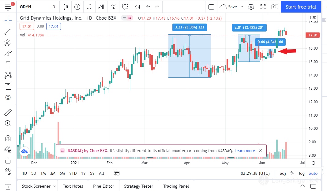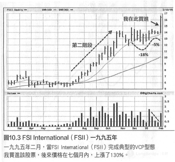 由于笔墨所限,所以笔者无法详谈 VCP 型态。简单来说,股价的波幅不断收窄,最后提供一个波幅小于 10% 的低风险进场点。此时就是买入的最佳时机。