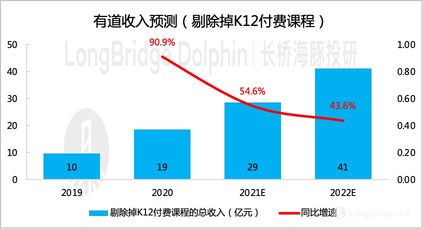 (3)对于目前正在枪口上的有道教育业务,海豚君对于未来业务增长情况宁愿选择相对保守的预期,即完全剔除掉 K12 业务,仅看成人课程、学习产品以及广告等业务情况。
