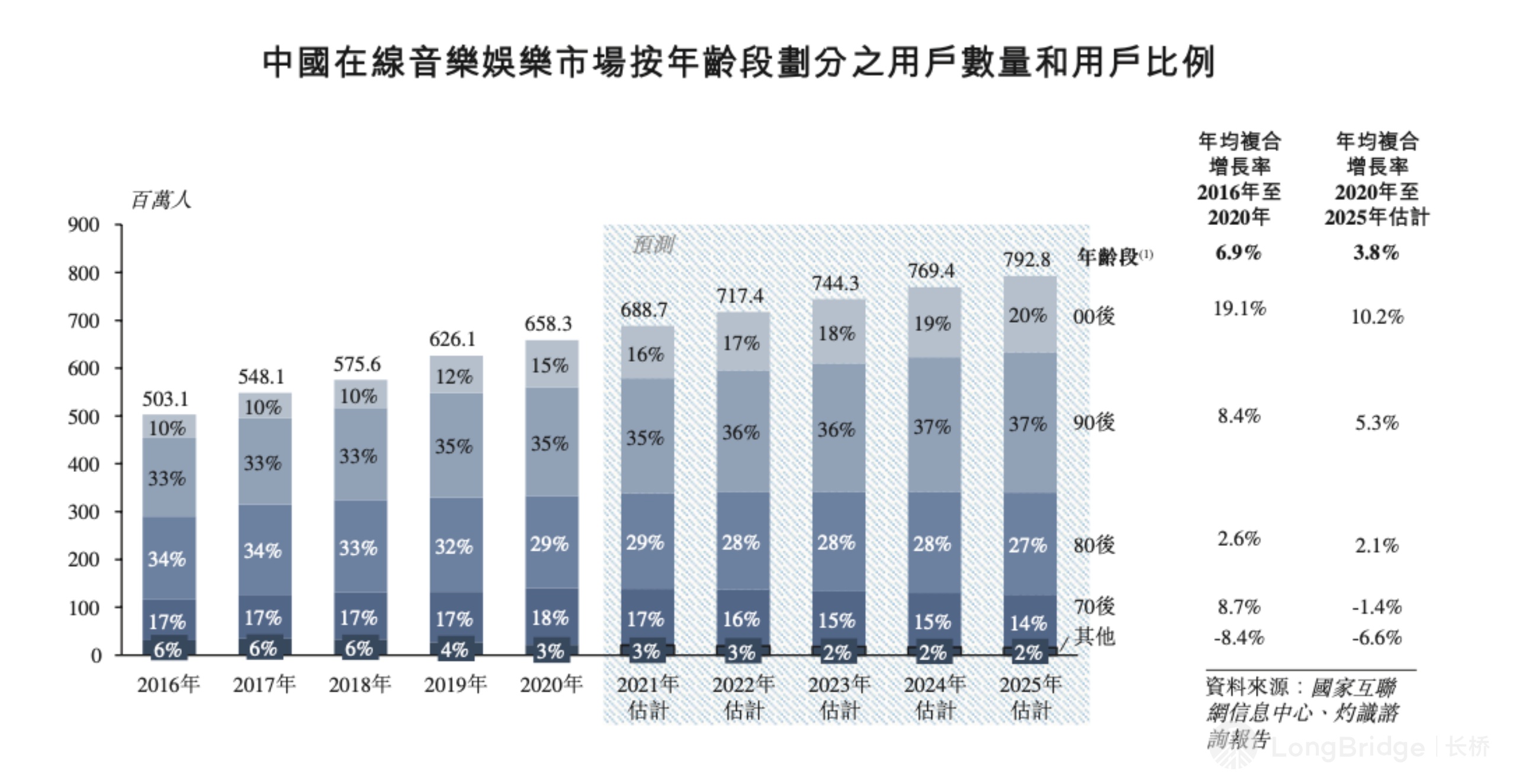 在灼识咨询的预测中,在线音乐市场整体用户规模未来 5 年复合增速只有 3.8%。但其中 90 后用户增速将显著高于其他年龄段,2021-2022 年每年增速能够落在 7%-8% 区间,00 后的用户增速则触达 11-12% 的年增速。
