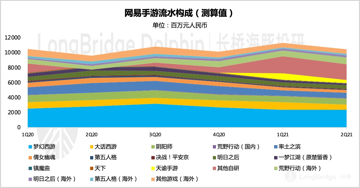 尽管梦幻西游手游的流水占比也大约占了网易整体手游流水的 20%(七麦数据、海豚测算值),但《荒野行动》、《阴阳师》、《率土之滨》、《明日之后》等等其他二梯队的热门手游之间也不相上下。