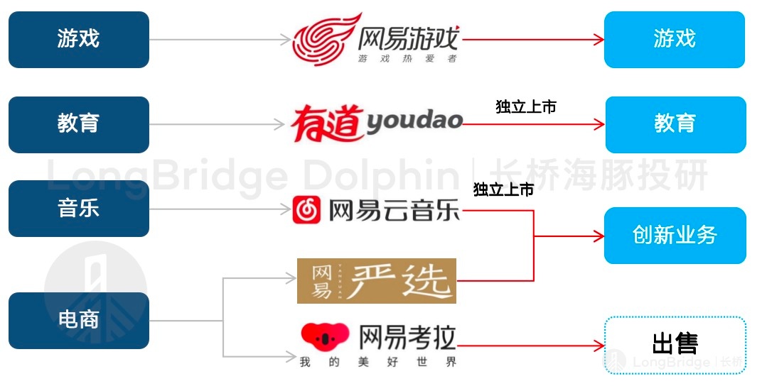 网易旗下的产品和业务也曾经非常丰富。除了游戏外,邮箱、门户、电商、音乐、广告、教育等领域都有过布局。2019 年初,丁磊还在高喊 “游戏、电商、教育、音乐” 四轮驱动战略。转眼一年不到,电商大头——网易考拉已卖给阿里,而教育业务全部整合至网易有道单独上市。
