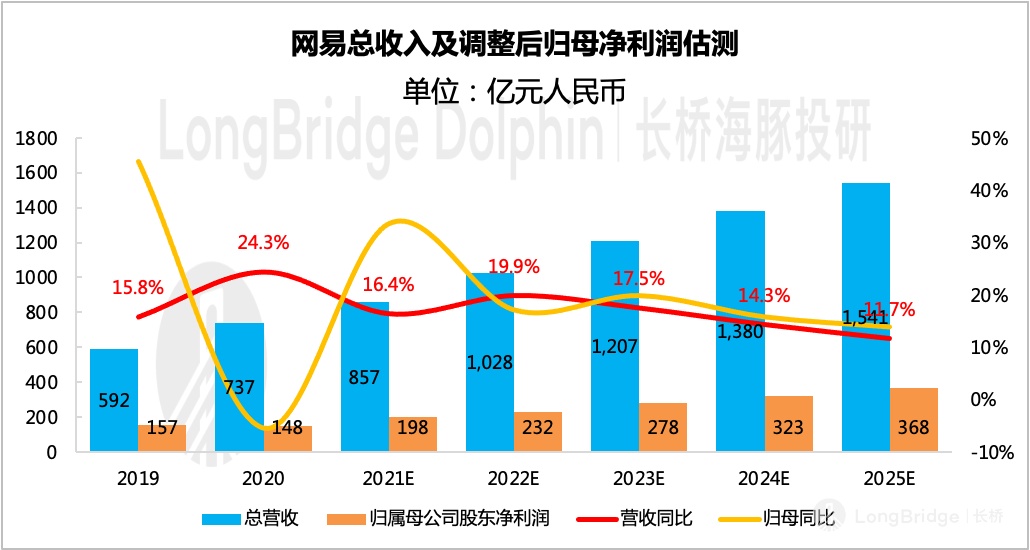 总结来看,海豚君对网易未来的增长预期偏中性,整体业务收入增速以及整体利润情况如下: