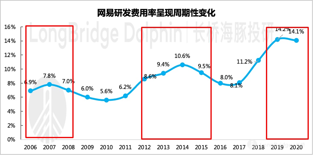 但考虑到研发进度原因带来的游戏延迟公测的情况,我们还可以从网易的研发费用率和游戏业务员工规模变化周期来判断产品的大小年。