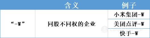 “-W”指的是同股不同权的公司企业,为英文中 “Weighted Voting Rights” 的首字母缩写。所谓同股不同权,就是说股东是股东,投票权是投票权。像小米集团、美团点评和快手等都是同股不同权的企业。