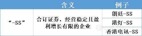 -SS,表示“合订证券”(Stapled Securities),是一个特殊的种类。只有朗廷-SS、港灯-SS 和香港电讯-SS 这种经营稳定且盈利增长有限的公司后面被加上“-SS”的后缀。可以理解为固定单一信托模式的高股息分红品种。这种并不常见,我们也就不过多赘述了。