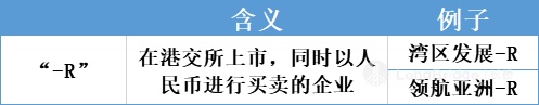 像湾区发展-R、领航亚洲-R 等企业这种在港交所上市,同时以人民币进行买卖交易的公司,在股票后面会被加上“-R”。