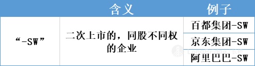 像百度、京东、阿里巴巴等这种在港交所二次上市,同时又同股不同权的企业,因此股票名称后面加的是“-SW”的后缀。