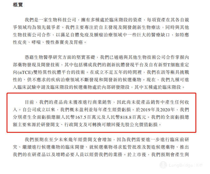 为了方便大家理解,以 “康诺亚-B” 为例,我们来看一下它的招股书。根据招股书,目前康诺亚并未产生任何收入,且每年产生经营亏损,产生的全面亏损总额分别为 1.675 亿人民币及 8.188 亿人民币,处于一个未盈利的状态。