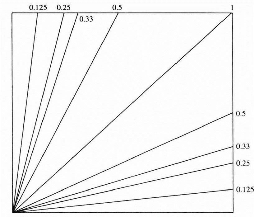 江恩角度線是指跟據股票及商品的時間及價位,即其獨有的波動率去畫成的扇形預測工具。它代表了時間與價位處於平衡的關係,若根據某一模式的時間、價位同時到達這一平衡點時,市場將發生重大震盪。即是「當時間與價位成四方形」。江恩一直強調節奏,平衡,和諧地運行。當角度線相交或形成某個角度,將會產生共振而令市場產生變化。江恩角度線其中最重要的是 1X1 線,1X1 線所代表的,乃是一個單位的時間相等於一個單位的價位,亦即是 45 度角線。江恩線的基本比例為 1:1,即每單位時間內,價格運行一個單位。另外,還有 1/8、2/8、1/3、3/8、4/8、5/8、2/3、6/8、7/8 等。每條江恩線有其相對應的幾何角。對應關係見表 4-1。
