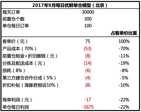 而根据 GPLP 的调研,2017 年底每日优鲜前置仓的单仓模型还未完全跑通,光损耗就还在 8% 左右(目前为 2%),并且还在 “满 99 减 80” 疯狂补贴的用户培养阶段。最关键的是,在当时拥有 300 多个仓的北京,平均单仓每日只有 100 单,远远小于海豚君测算的 1500 单最低标准,因此单仓的盈利水平也就很不乐观。