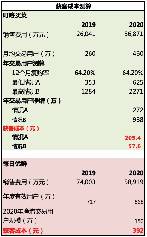 由于叮咚买菜与每日优鲜的用户规模统计口径存在差异,一个是月均交易用户,一个是年交易用户。因此海豚君对叮咚的用户规模做了一定的调整测算后,发现哪怕是按照最低净增用户规模的情况,叮咚的单用户获客成本(209 元/人)都要明显比每日优鲜更低(392 元/人)。