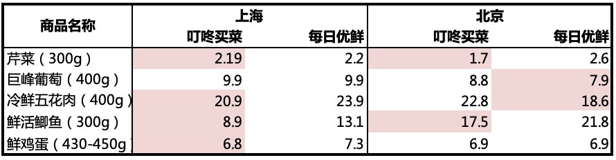 而目前来看,叮咚买菜的商品价格在多数上相比每日优鲜更优惠一些(不排除一些临时补贴因素存在,标红为价格更低廉的一方)