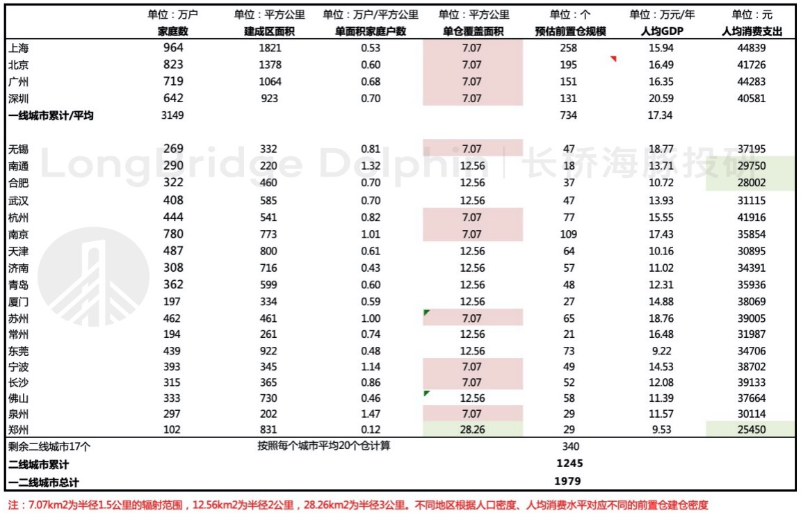 海豚君选取一二线中人均消费支出在 3 万以上的共累计 22 个城市,作为叮咚买菜期望以中心城区全覆盖性质的开城建仓目标地区,剩余 17 个二线城市按照部分城区覆盖建仓的情况,以 20 个/市的规模来进行扩张。通过各个城市的建成区面积与单个前置仓辐射的面积之比,计算出前置仓需求数量潜在规模为 2000 个左右。