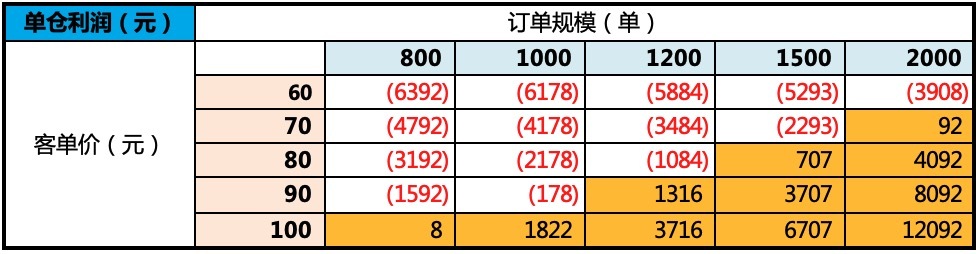 回顾海豚君在上篇中详细测算的【单仓 UE 模型】,虽然单日订单量对最终盈利情况影响弹性更大,但客单价的影响也并不小。