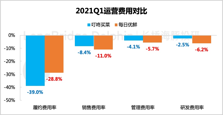 在整个运营费用端,单论前置仓生意,叮咚买菜与每日优鲜的主要差异就在于履约费用和销售费用。(每日优鲜 2020 年开拓智慧零售云的 B 端业务,因此研发费用率仍保持高位,这里不作讨论)